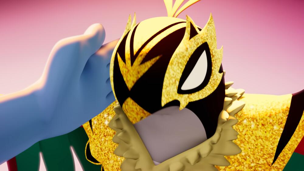 ルチャブルがメガシンカした姿。赤いマスクが金色になり、よりゴージャスな雰囲気になっています。一見すると見た目があまり変わりありませんが、大きさや体重が少しだけ増えています。
