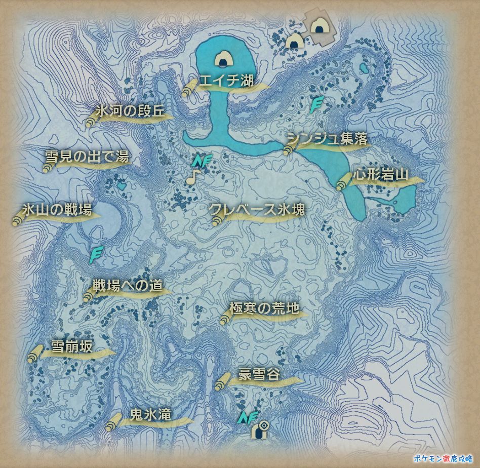 【レジェンズアルセウス】純白の凍土『キッサキ神殿(キッサキしんでん)』のマップ画像と、出現ポケモン、オヤブンのポケモン場所リスト、ともしび・アンノーン、ぼんぐり・きのみ・たまいしの場所を掲載しています。