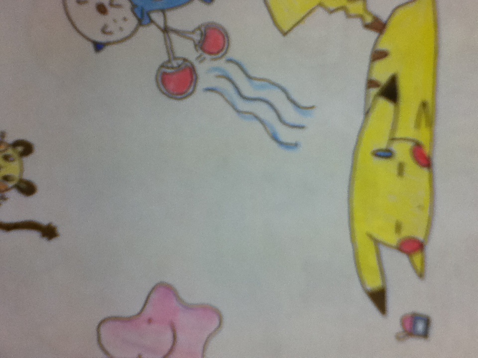 夏で暑いこの時期にピカチュウが夏バテして、ミジュマルなどに涼しくしてもらってるところを描きました!一応、落書きです^ ^
