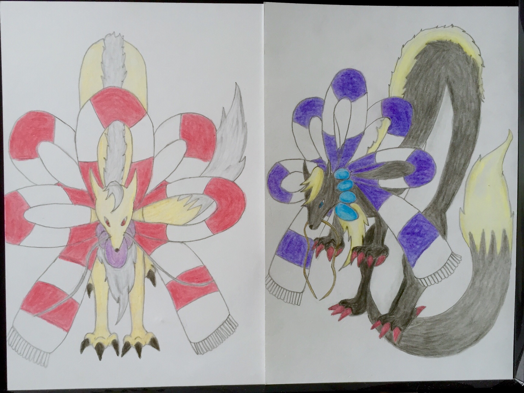 結構前に描いた管狐ポケモンの最終進化系です。いろいろ詰め込みすぎて気持ち悪い感じになって、もっとシンプルにしようと修正を何度も繰り返し、今の形に落ち着きました…今までで一番書くのが面倒なオリポケな気がします。