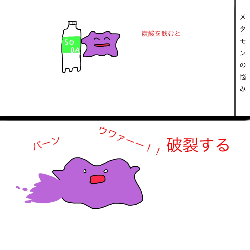 メタモンは液体です。(多分)なので、泡を含む飲み物を飲むと泡が発生します。でも、謎の表面張力で泡が抜けないので、溜まりすぎて破裂してしまうのです。ただ、ちょっと楽しいらしいです。やりすぎると危険だから、1ヶ月に3回ぐらい、自分のご褒美感覚でやっているそうです。もしパートナーにメタモンがいる方は、炭酸水をあげてみてください。多分破裂します。