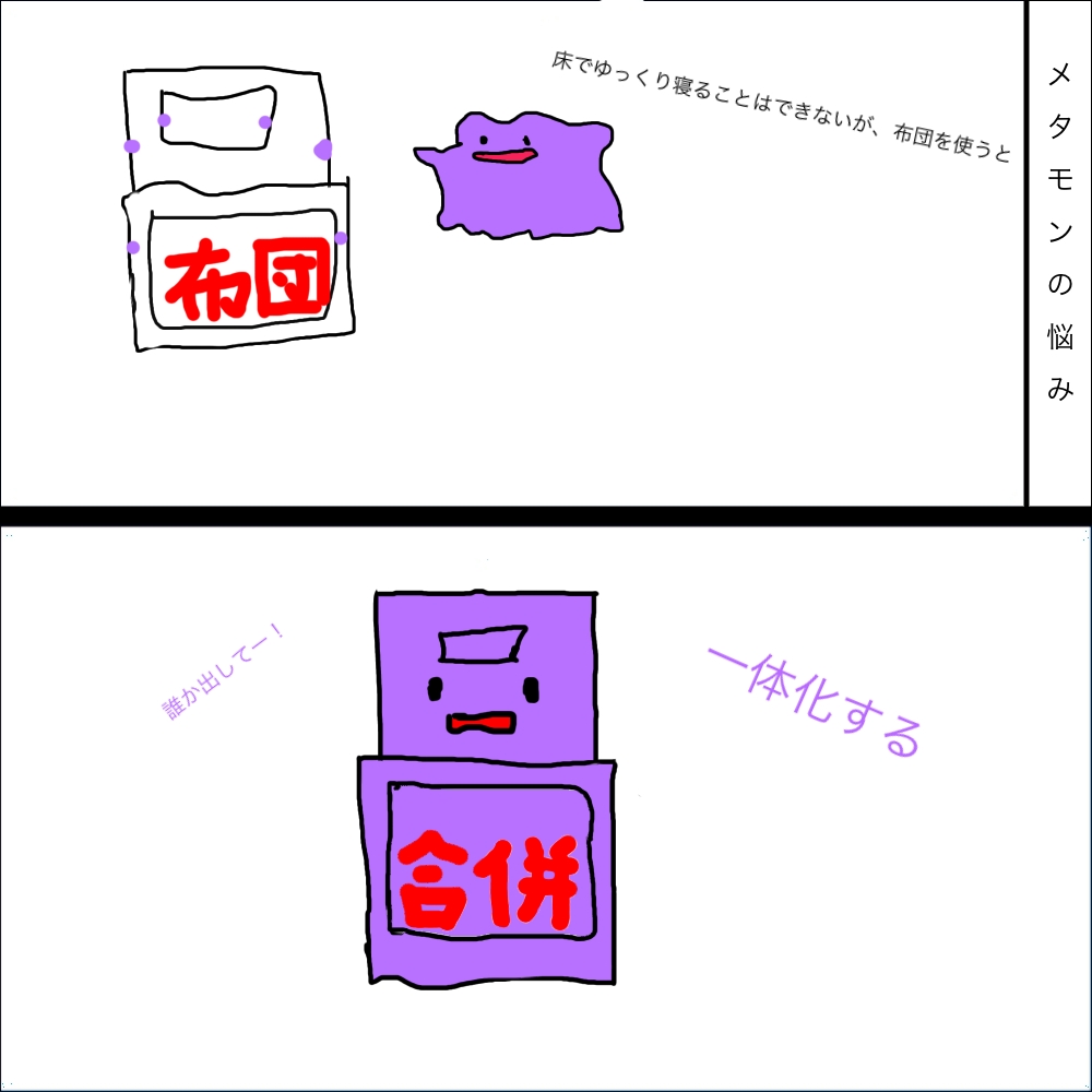 メタモンは木材の床で寝ると腐ります。だからと言って布団を使うのも大変。布団と一体化してしまうのです。そうなれば、脱出はなかなかに大変。ちなみに、布団を準備する時点で少し吸収されているので、周りをよくみている、または賢い、運良く気付けたメタモンは早めにしまっています。カーペットも使えないそうです。布製品全般が敵。もしメタモンがパートナーの方は、布製品はできる限り閉まっておいてあげてください。行方不明になったら、布団をよくみてくださいね。