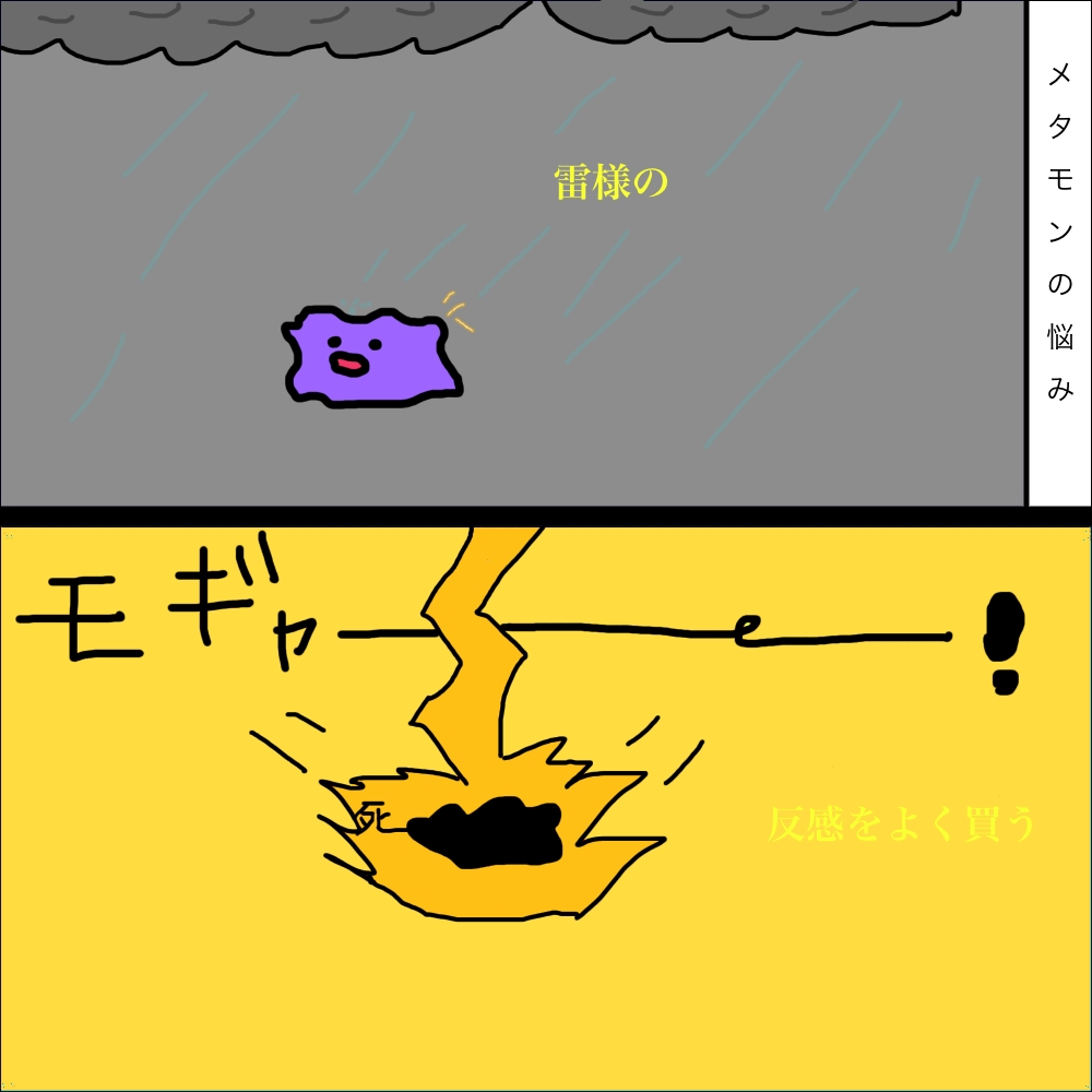 雷様のターゲットは高いところにあるもの、もしくは液体という噂を聞いたことはありませんか?メタモンは液体ですので見事にターゲット。雷様に悪いことなど一才していなくとも、問答無用で一発落とされます。町のメタモンは50%ぐらいの確率で雷直撃したことあると回答していました。皆さんも、自分の命を守るため雷がなったら高い木の近くや水辺には行かず、家でゆっくり過ごしてくださいね。