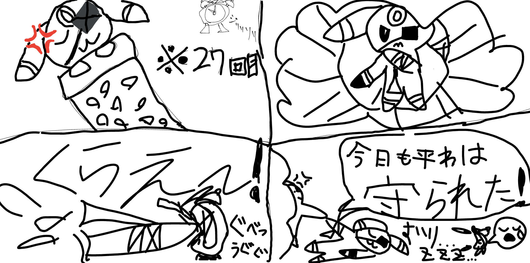 27回も時計のアラーム無視してたんだ。ある意味天才!でも、いい夢見てるね!ヒーローだもん!これからも頑張ってください!