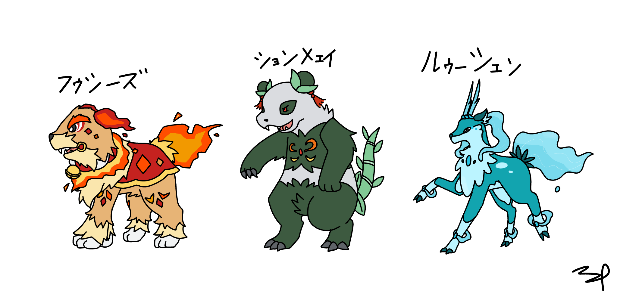 草の御三家はパンダが主なモチーフ(ションメェイはチャイナ服など)