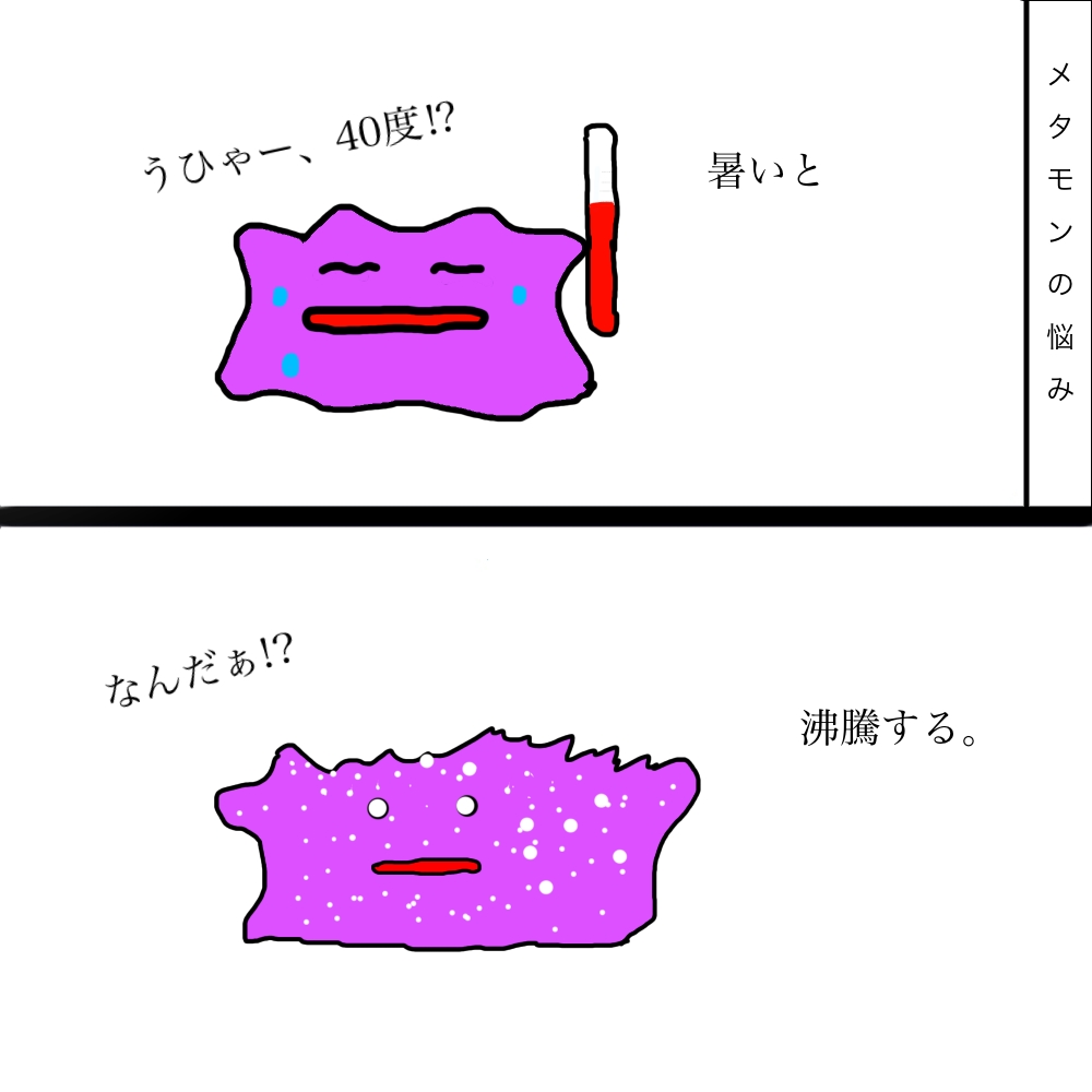 水の沸点が100度なのは有名ですが、メタモンの沸点は約40度。どうやら、最近の地球温暖化によって40度を超える国が多くなってきたみたいで、体内がぐつぐつしているメタモンがよく現れるようになりました。この状態のメタモンは熱中症になりやすいので体調管理はしっかりしてあげてください。もちろん自分のこともね。地球温暖化が原因といえばそうなので、対策を考えて、メタモンを守ってあげてください。