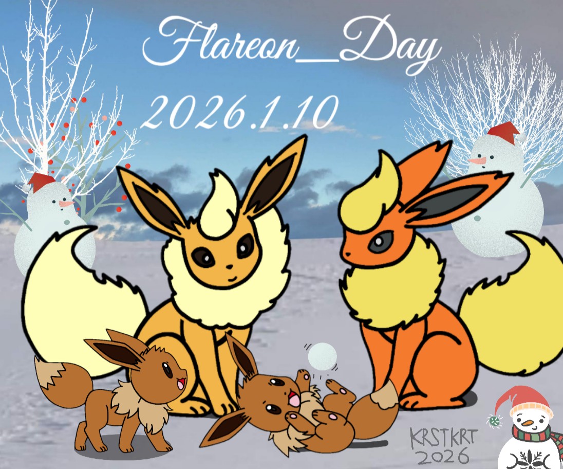 コメントありがとうございます。3日間もコメントがあったことに気が付かず、ブースターの日も新年初に遅刻してしまいましたがコメントを返信させていただきます。先週土曜日、信州へ旅行に出掛け、その当時に撮った写真を合わせ、飾りを付けながら描き、私のイメージを想像に普通のブースターが♂で色違いのブースターを♀としてイーブイとの親子愛を流れに描いてみました。また今年のお正月は家でゆっくり休んでおり、新年の挨拶も過ぎてしまいましたが今年も1年間よろしくお願いします。